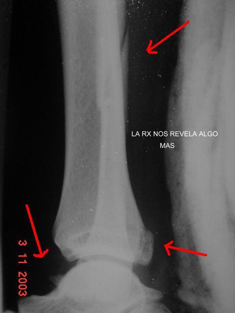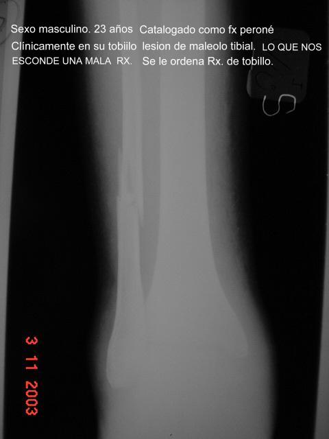 Las tres Rx son del mismo paciente. UNA RADIOGRAFÍA de pierna que cataloga al paciente como fractura del peroné solamente. La clínica se impone. Las otras radiografías confirman a la clínica.